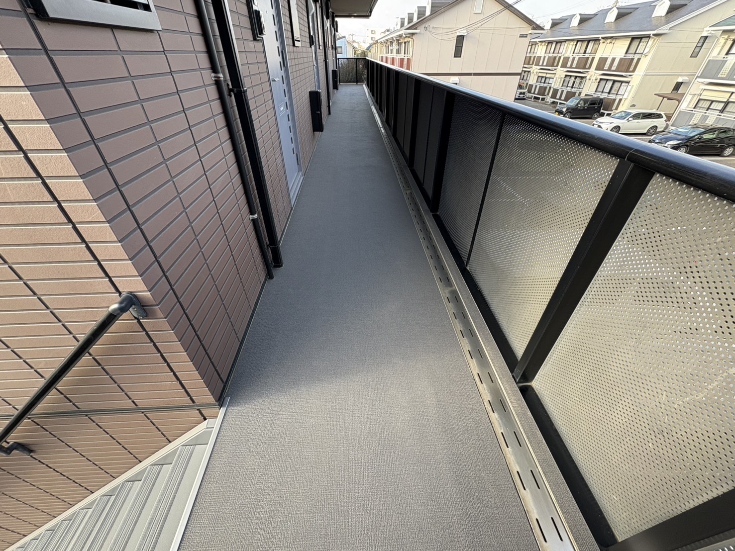 こんにちは、取手市で内装工事をしてる沼尻創美です。今回は、茨城県つくば市の賃貸住宅 外部廊下の床にて長尺シート・防滑シート貼りをしました。